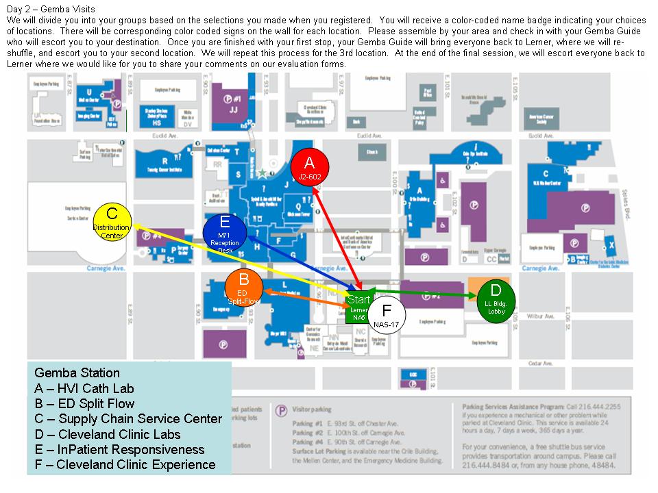 Day 2 of the event will provide an opportunity for participants to choose 3 of 6 Gemba visits to sites on the Cleveland Clinic main campus. Participants will have the opportunity to see U.S. News and World Report‘s leading Heart Center for the past 18 consecutive years; our Pathology and Laboratory Medicine’s new building that used lean principles in its design; our state-of-the-art Supply Distribution Center; our Emergency department that has effectively implemented a split-flow process to improve patient flow; our nursing floors where we have implemented a process to improve patient responsiveness and finally; have the opportunity to participate in a condensed version of the Cleveland Clinic Experience – a 3.5 hour enterprise alignment activity that over 42,000 Cleveland Clinic caregivers around the world have participated in.