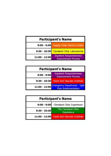 Participants received a name tag with their color-coded choices for their 3 gemba sites. We posted color-coded Gemba signs in the Gemba central hub location and when every group had returned to the central hub, we asked everyone to “shuffle” for their next site. Gemba guides also had color-coded name tags to help with the proper identification of the location of the tour.