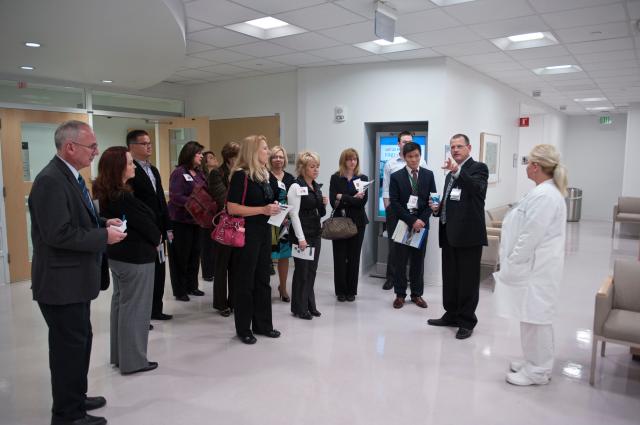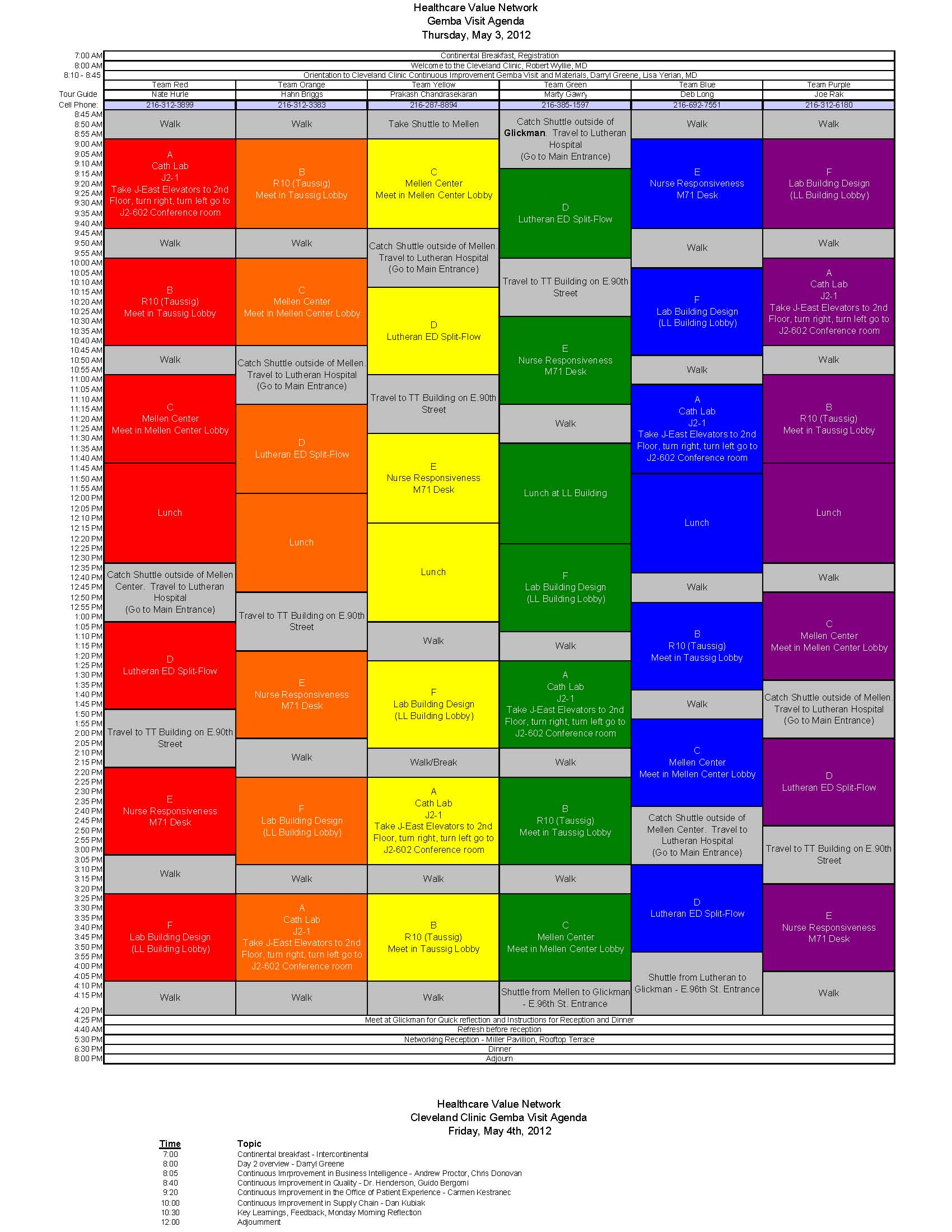 Earlier this year, we hosted approximately 50 people from member organizations in the Healthcare Value Network during a Gemba visit. We selected six sites to visit, broke the larger group into 6 smaller groups and established a golf tournament “shotgun” start process that had each group starting at a different location, then rotating counterclockwise through the series of 6 locations throughout the day. We even added a visit to one of our regional hospitals one week prior to the event, requiring a 30 minute shuttle drive.