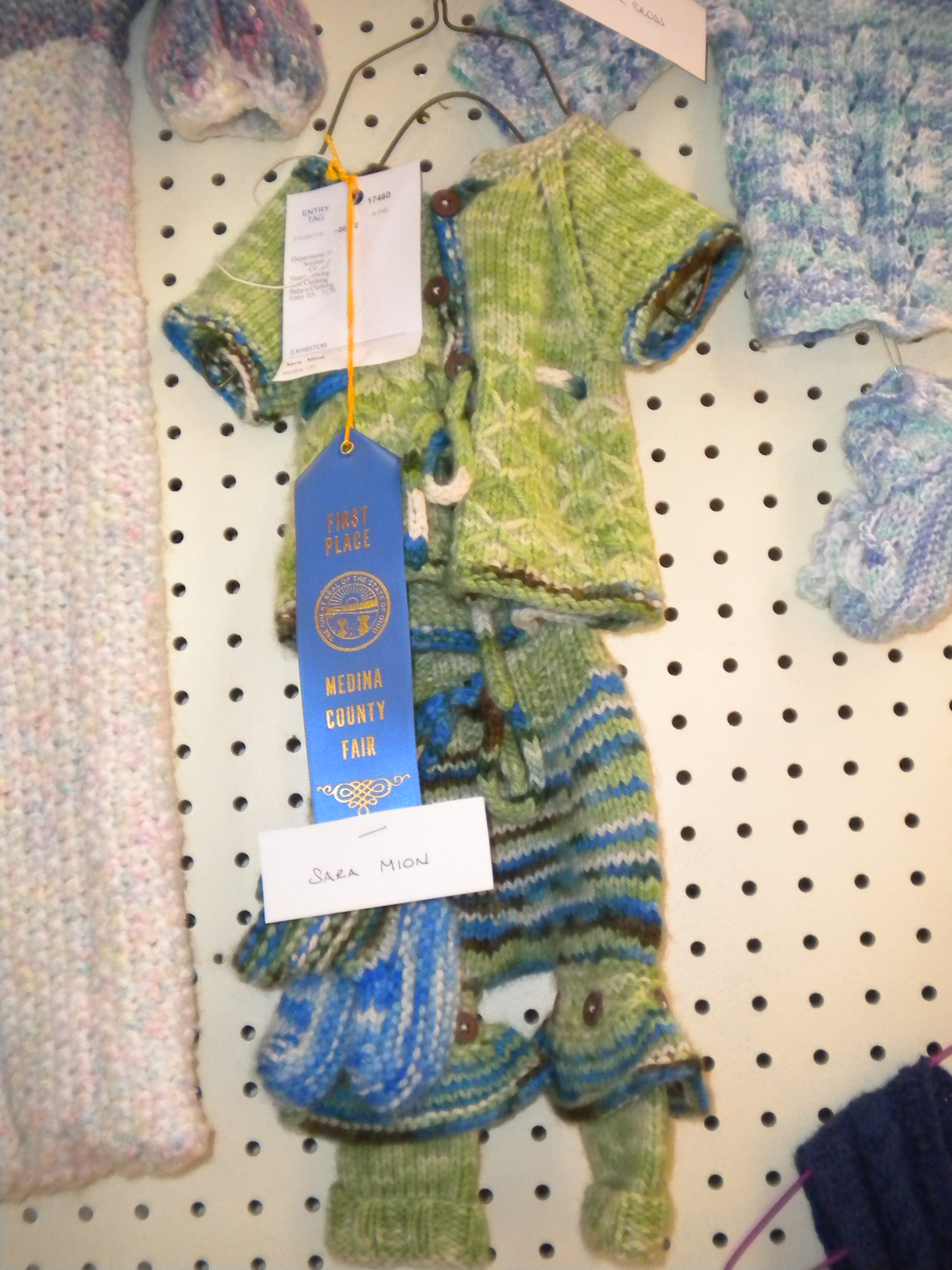 Next up, the open class still exhibits where my daughter, Sara, (who only started knitting a little over a year ago), proudly displayed articles of clothing she has knit for her children. Sara’s projects earned her a First place and several other second and third place ribbons. She can now proudly call herself an award-winning knitter. Actually, one of her projects won a ribbon at last year’s fair, so she was already an award winner. You can see some of her work here and make a purchase if you’re interested.